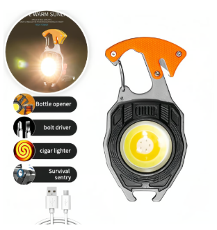 Multifunctional COB Keychain Flashlights: This LED rechargeable COB Keychain work light comes with a life-saving whistle, wrench,rope cutter,screwdriver, bottle opener and lighter,15 functions, but only weighs 70 grams,making it an all-in-one tool for your outdoor dventures.widely used for fishing, walking and camping, corkscrew, emergency roadside maintenance, Etc.